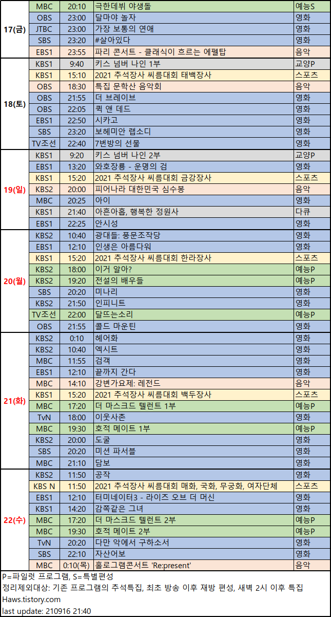 포털에서 페이지로 언급되지 않은 OBS 편성표도 화요일 분량 포함해서 올립니다.