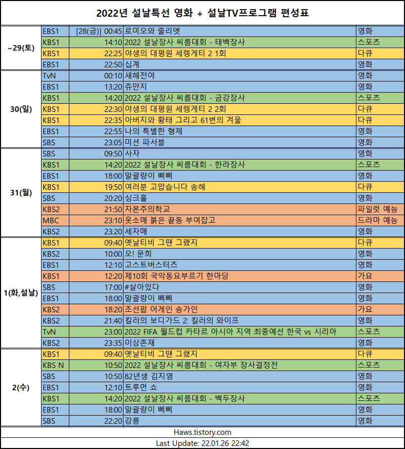 2022년 설날특선영화 + 설날TV프로그램 편성표 본문